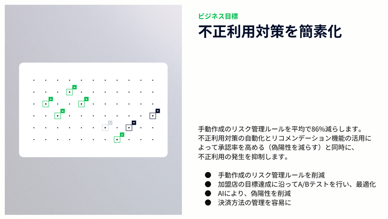 これに対して、今回リリースしたAdyen Upliftは、AIやマシンラーニングを活用したモデルにより、手動作成のリスク管理ルールを平均86%削減しました。つまりベースはAIやマシンラーニンで、クレマスアタックなどを受けた場合は即時にブロックするといった機能が導入されました。犯罪者の手口は巧妙化しています。最新の不正トレンドに、人間の手を煩わせず、マシンラーニングで適切に、迅速に対処できるツールになっています。不正を防ぎたいがためにブロックしてしまっていた偽陽性の取引を取り逃さないためにも、AIやマシンラーニングの力を借りて対応しているというものになります。