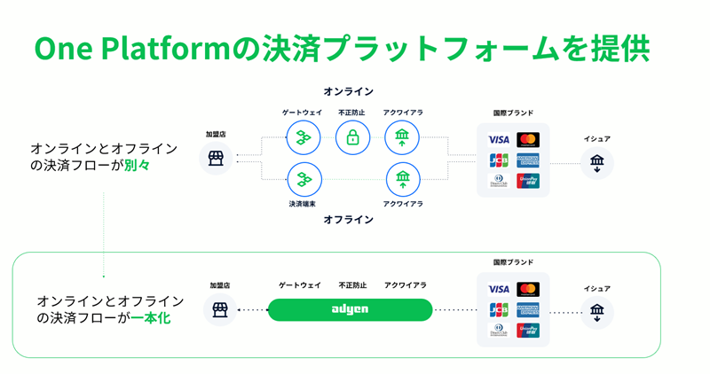 ワンプラットフォームという点についてですが、全世界でワンプラットフォームで運営、オンラインとオフラインもワンプラットフォームで処理、機能としてはゲートウェイ・不正リスク・アクワイアリングもワンプラットフォームで、一気通貫で処理しています。実はプロダクトもワンプラットフォームですので、海外でつくられたプロダクトを日本国内に展開するということが非常に簡単にできるという特長もあります。