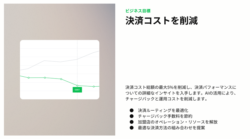 3つ目の決済コスト削減のところですが、Adyenでは、日本での展開はまだなのですが、決済を流すルートを最適化することによって、不正やチャージバックを抑止したりすることができるようになっています。たとえばアメリカにはVisa、Mastercardがあったり、USデビットがあったりしますが、そういったところを自動的にルーティングするような機能が導入されています。また、どのような決済手段を導入すれば収益が上がるかを、コストを踏まえて、AIが加盟店に提案するという機能もあります。