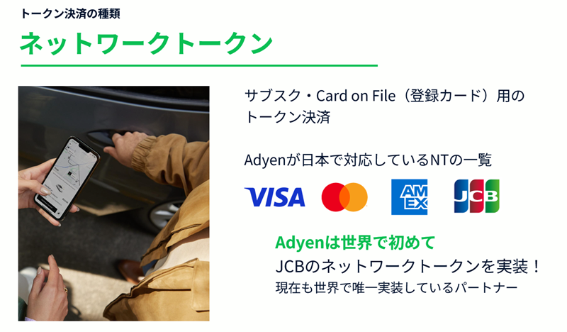 もうひとつ、ネットワークトークンのお話をさせていただきたいと思います。サブスク、Card on File用のトークン決済であり、Visa、Mastercard、AMEX、JCBに対応しています。JCBについてはグローバルでもAdyenだけが対応しております。とはいえAdyenは国際ブランドの言いなりになっているわけではありません。国際ブランド各社は口々に高い承認率を維持していると言うのですが、イシュアによって差があるのが実情です。AdyenにはBINごとの承認率によって、ネットワークトークンに流すものと、普通のPANを使うものとを振り分ける機能を組み込んでいます。