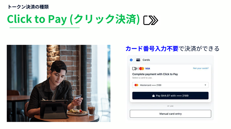 Click to Pay(クリック決済)は、カード番号の入力不要で決済ができる仕組みです。Click to Payのボタンを押すと、登録済みのカードのリストが、使用頻度の高い順に並んで表示されます。逐一カード情報を入力する必要がないので非常に便利です。AdyenはVisa、Mastercardにグローバルで対応済みです。先ほども申し上げましたが、今すぐ導入したいという加盟店には即時に対応が可能です。
