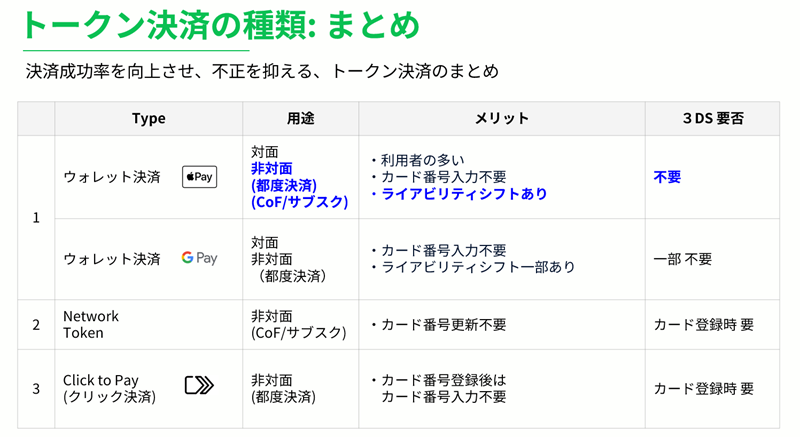 Apple Pay、Google Payなどのウォレット決済、ネットワークトークン、Click to Payを比較してみますと、その利便性は、3DS2の要否が大きなポイントになるのではないかと思います。チャレンジ認証のフリクションは下がっているとはいえ、やはりカゴ落ちの要因になります。Appleはイシュアとよく話をされて高いセキュリティを維持しながら、3DSを不要としているところが非常に魅力的だと感じます。ネットワークトークン、Click to Payは国際ブランドの立場から初回の3DS2を必須としているところが、Appleとの大きな違いです。