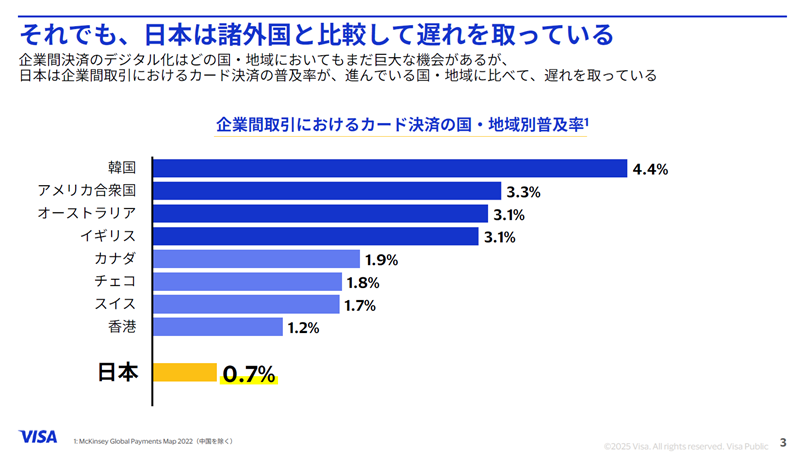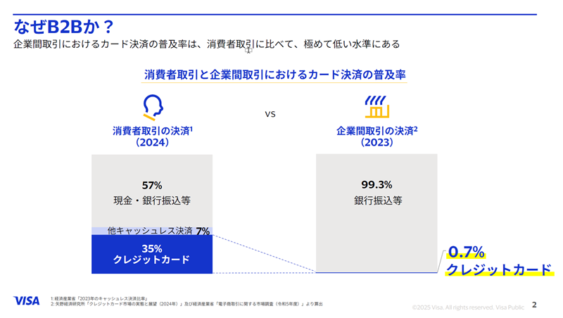 企業間取引におけるカード決済の普及率は、消費者取引に比べて、極めて低い水準にあるという。日本の企業間取引の決済は年間1,000兆円を超える取引額と巨大な市場にもかかわらず、その取引の多くが銀行振込で決済されている。2023年の企業間決済は99.3%が銀行振り込みなどであり、カード決済の普及率は0.7%となっている。