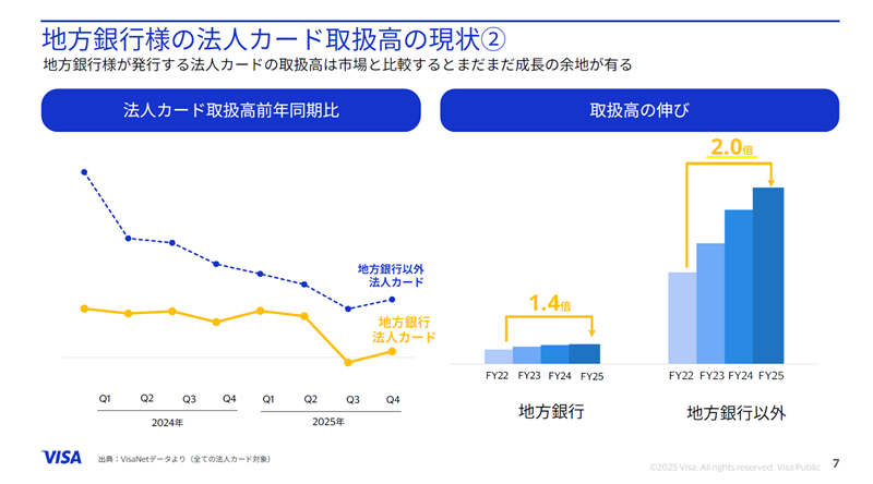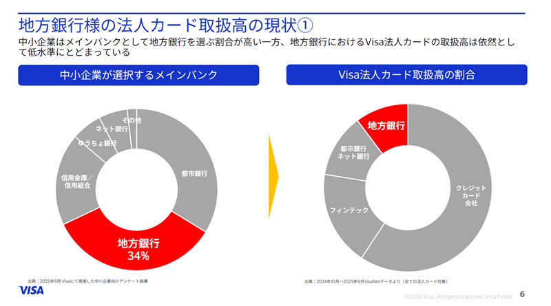 Visaが委託し、2025年9月に実施した調査では、中小企業はメインバンクとして地方銀行を選ぶ割合が高い一方、地方銀行におけるVisa法人カードの取扱高は依然として低水準にとどまっている。地方銀行様が発行する法人カードの取扱高は市場と比較するとまだまだ成長の余地が有る。4年間での伸び率も1.4倍と、地方銀行以外の2倍に比べて差があるという。