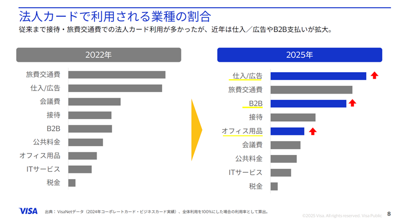 法人カードで利用される業種の割合を見ると、従来まで従来は旅費、交通費や接待などでの法人カード利用が多かったが、近年は仕入/広告やB2B支払い、オフィス用品が拡大している。