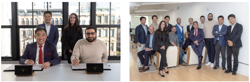 (左上から)ソニー銀行株式会社 専務取締役:渡邉 尚史氏、Bastion Platforms, Inc. COO:Caroline Friedman氏、右写真は業務提携契約締結の風景(ソニー銀行)
