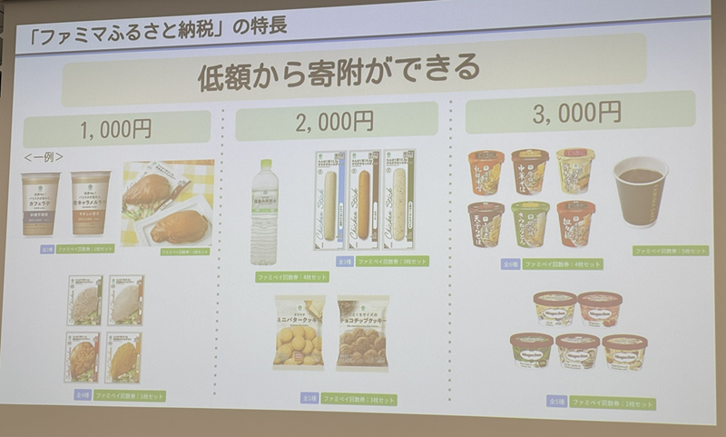 ファミマふるさと納税では、日常使いの返礼品をラインナップしている。1,000円、2,000円、3,000円など、低額から寄付できるのが特徴だ。例えば、12月は控除額の上限がはっきりする時期だが、これまで4万7,000円の寄付を行った行った人が、残り3,000円分を普段購入するコーヒー、お水などで寄附することが可能になるため、調整に最適だとした。