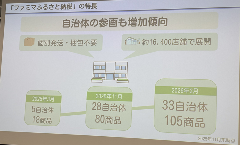 ファミマふるさと納税は、2025年3月に5自治体18商品からリリースしたが、2025年11月で28自治体、80商品となった。2026年3月には33自治体、105商品に達する見込みだ。