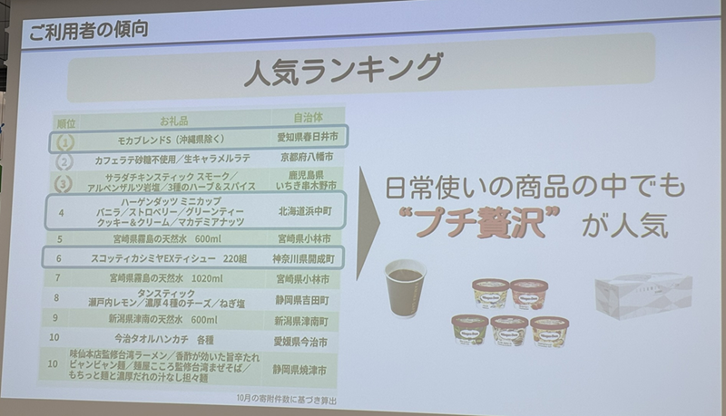 ファミマふるさと納税の返礼品人気ランキングを見ると、1位がモカブレンドS(愛知県春日井市)、2位がカフェラテ砂糖不使用/生キャラメルラテ(京都府八幡市)、3位がサラダチキンスティック(鹿児島県いちき串木野市)、4位ハーゲンダッツミニカップ各種(北海道浜中町)、5位宮崎県霧島の天然水600ml(宮崎県小林市)、6位スコティッシュカシミヤEXティシュー(神奈川県開成町)となっており、通常の店頭販売でも人気の商品が上位にランクインしている。日常使いの商品の中でも“プチ贅沢”が人気だという。