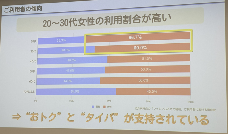また、利用者の傾向を見ると、20~30代の女性の利用割合が多い。これらの世代は、サラダチキン、カフェラテ、ハーゲンダッツなどで寄附されているのが目立っており、“おトク”と“タイパ”が支持されているそうだ。