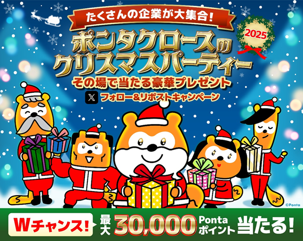 共通ポイントサービス「Ponta(ポンタ)」を運営するロイヤリティ マーケティング(LM)は、「ポンタクロースのクリスマスパーティー2025」をX上で開催する。同キャンペーンは、2025年12月11日~12月25日、Ponta公式Xアカウントと、6つの企業公式Xアカウントが合同開催する。