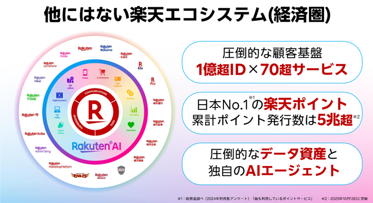 楽天エコシステム(経済圏)は、1億超ID および70を超えるサービスにより圧倒的な顧客基盤を有している。また、日本屈指のポイントを自負する楽天ポイントの累計ポイント発行数は5兆を超える。さらに、圧倒的なデータ資産と独自のAI エージェントを展開している。楽天グループ 代表取締役会長兼社長 三木谷 浩史氏によると、今回の提携は、楽天エコシステムと、世界最大級のモビリティとデリバリーのプラットフォームである「Uber」および「Uber Eats」との「新たな価値の共創」となるそうだ。