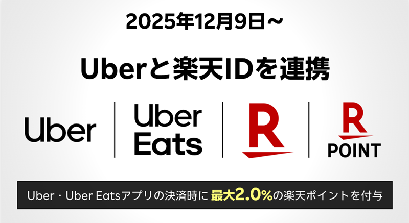 12月9日より、楽天IDとUberとの連携サービスを開始する。「Uber」と「Uber Eats」において、楽天ペイメントが運営する共通ポイントサービス「楽天ポイント」オンライン導入を順次開始し、両アプリ決済時に最大2.0 % の楽天ポイントを付与するという。貯めたポイントは楽天の70以上のサービスで利用可能だ。