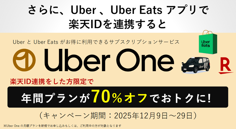 さらに、楽天IDを連携した「Uber One」の月額会員には、年間プラン(3,998円)を70%オフの特別価格で提供するとした。