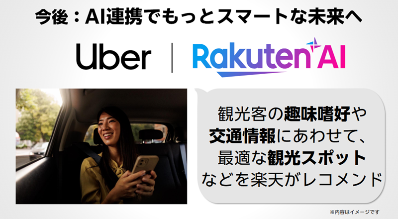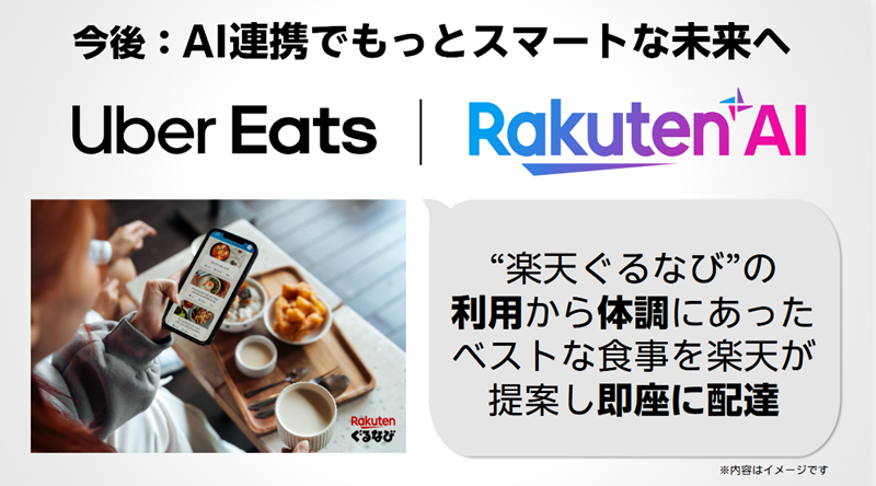 今回の提携は第一弾であり、今後はAI連携でもっとスマートな未来が実現できるとした。例えば、観光客の趣味嗜好や交通情報にあわせて、最適な観光スポットなどを楽天がレコメンドすることも考えられるとした。また、“楽天ぐるなび”の利用から体調にあったベストな食事を楽天が提案し、即座に配達することも挙げられる。