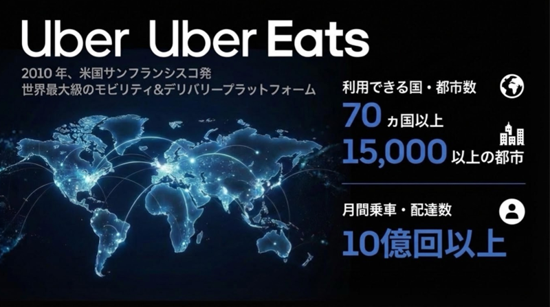 「Uber 」「Uber Eats」は、2010年、米国サンフランシスコ発のモバイル・デリバリープラットフォームで、世界70カ国以上、1万5,000以上の都市で利用されているという。また、月間配車・配達数は10億回以上だ。2010年からの事業成長は約10倍、タクシー事業者数は約1,000社となっている。石川県加賀市などでは、公共型ライドシェア事業を展開している。