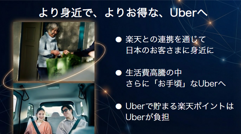 Uber Technologies 最高経営責任者 Dara Khosrowshahi(ダラ・コスロシャヒ)氏によると、今回の楽天との提携は、両社のユーザーをより密接に結びつけ、生活費高騰が続く日本で大きな意味があるという。また、「『Uber』『Uber Eats』で付与するポイント原資はUberが負担します」とコスロシャヒ氏は強調した。