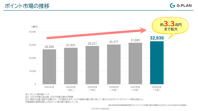 矢野経済研究所の調査結果によると、日本国内で発行されているポイントの市場規模は年々増え続けており、2028年度のポイント発行額は約3.3兆円になると予測されています。この要因としては、コロナ禍で落ち込んだ分野の回復や、物価上昇による取引額の増加が挙げられます。そしてその背景には、日常的にポイントを使える店舗が増加していること、QRコード決済やクレジットカードなどのキャッシュレス決済の利用額が増えていることがあります。さらに、「ポイ活」という言葉がすっかり定着しているように、ポイントを上手に貯める人が増えたことによって、発行額が一段と伸びています。