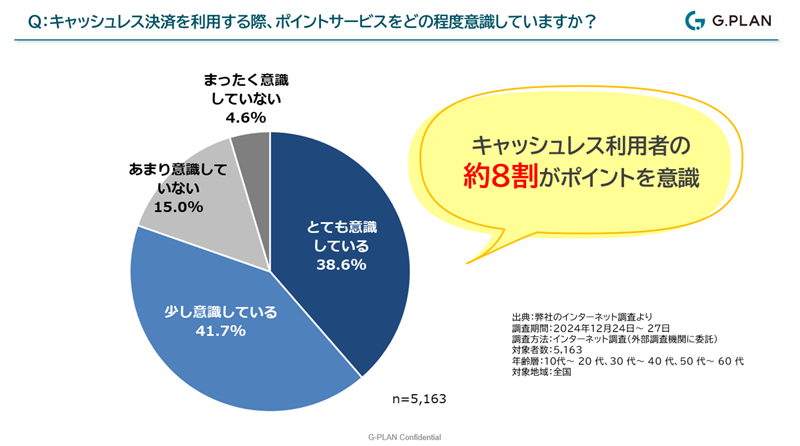 弊社では毎年、ポイント市場についての調査を実施しています。その中で、「キャッシュレス決済を利用する際にポイントサービスをどの程度意識しているか」という質問をしたところ、2024年12月に実施した最新の調査では、「とても意識している」が38.6%、「少し意識している」が41.7%、合わせて約8割がポイントを意識しているという結果になりました。大多数の利用者が、ポイントの獲得・利用に対して積極的であるといえます。