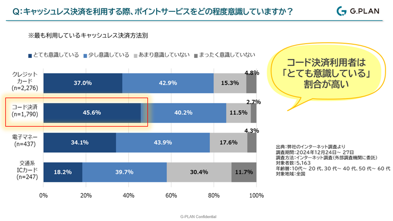これを、最も多く利用しているキャッシュレス決済手段別に見ると、コード決済を最もよく利用している人は、「とても意識している」が45.6%と高く、ほかの決済手段を最もよく利用している人と比較して、キャンペーンなどの施策に反応しやすいと考えられます。