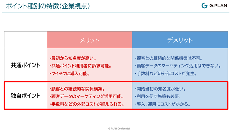 以上の話をまとめますと、知名度の高さ、使いやすさという点では共通ポイントにアドバンテージがあり、自社のマーケティングに生かすという点では独自ポイントが有効です。