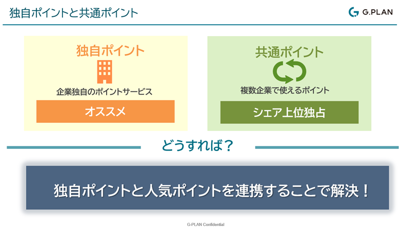 では、どうすればいいのか。弊社が出した結論は、独自ポイントを、人気のある共通ポイントと交換できるようにすることです。これによって、お客様との継続的な関係を構築できる、マーケティングへの活用が可能といった独自ポイントのメリットを残しながら、知名度の高さ、ユーザーの使用頻度の高さといった共通ポイントのメリットを享受することができるのです。