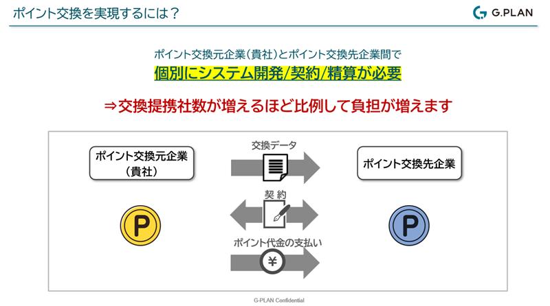 交換元企業は、交換実績に基づいて交換先企業にポイント代金を支払うことになります。そのコストを負担してもなお、ポイント交換を可能にする価値があるのかどうかということについては、「ただ外に出ていくだけ」とマイナスにとらえる向きもあろうかと思います。けれどもそもそも、お客様に選ばれなければポイントの意味はありません。そのコストは、選ばれやすくなるための投資だとお考えいただければよいと思います。