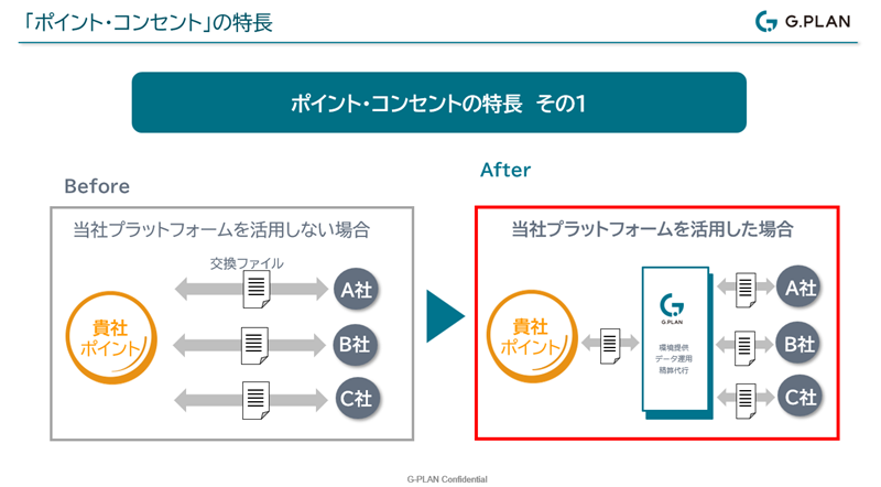 ポイント・コンセントの特長を2つ、ご紹介します。1つ目は、開発や運用にかかるコストや工数を削減できるという点です。ポイント・コンセントを使わずに直接、交換先企業とシステム開発を行う場合、交換先ごとにシステムの仕様が異なりますので、システム開発や交換データの連携を個別に行う必要があります。交換先を1社増やすために数千万円のコストがかかったというお話を聞いたこともあります。