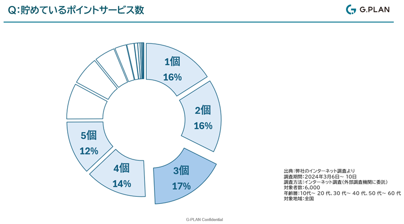 弊社の調査によりますと、消費者が貯めているポイントの数は、1個から3個までで約半数、5個までで4分の3を占めています。確かに、いろいろなポイントを分散して貯めるよりも、ある程度まとめたほうが、貯めやすいし使いやすいと思います。つまり、お客様に利用してもらえるポイントになるためには、上位5位に入ることが理想です。