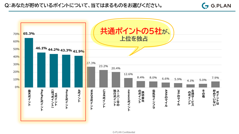 ただし、消費者が貯めているポイントのベスト5は共通ポイントが占めています。ここに独自ポイントが食い込んでいくことは、かなり難しいと思われます。