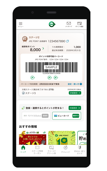 また、JRE POINT アプリのトップ画面等をリニューアル。JRE POINT アプリでログイン後、バーコードがトップ画面に表示されるようになり、スムーズに買い物ができるようになるそうだ。その他にも、トップ画面から登録カード管理、サービス連携状況、ステージ特典クーポン、鉄道乗車回数やお買いものキャンペーンの達成状況を確認できるようになる。