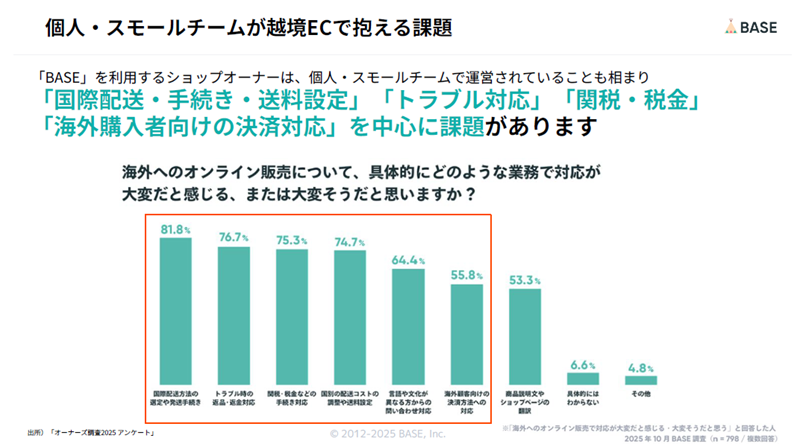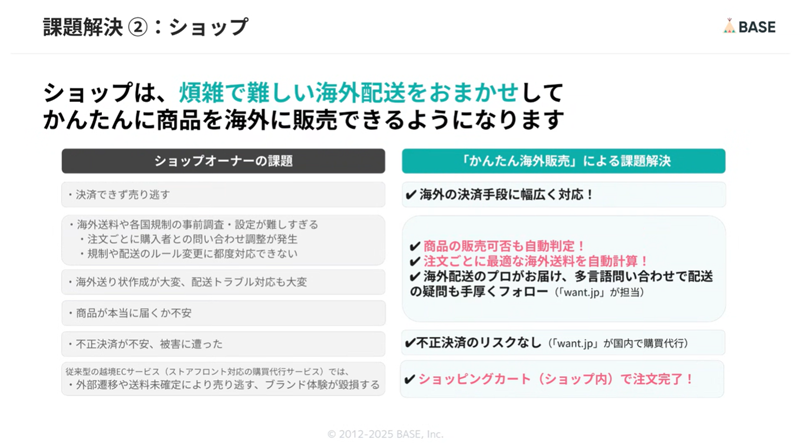 「BASE」を利⽤するショップオーナーは個人やスモールチームが中心だ。特に、「国際配送方法の選定や発送手続き」「トラブル時の返品・返金対応」「関税・税金などの手続き対応」「国別の配送コストの調整や送料設定」などで課題がある。BASEでは、"ブランドの世界観のまま、誰でもかんたんに越境ECができる"「かんたん海外販売」をリリースした。