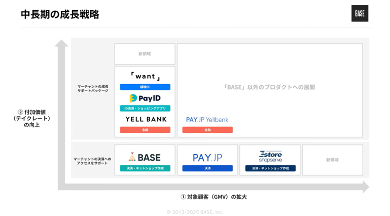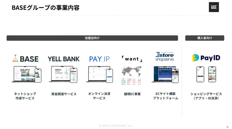 BASEは、ネットショップ作成サービス「BASE」、ID決済サービス「Pay ID」、「将来の売上」を「すぐに使えるお金」に代える資金調達サービス「YELL BANK」などの企画‧開発‧運営を行う企業だ。また、越境EC事業「want. jp」やECプラットフォームの「Eストア ショップサーブ」を買収するなど、事業を拡大している。