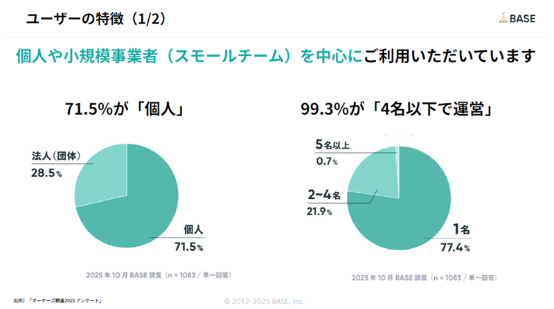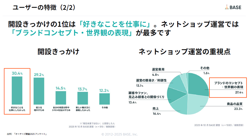 BASEは、誰でもかんたんに⾃らのネットショップを作成・運営できるストアフロント型のECサービスだ。71.5%が個人の利用者で、99.3%が「4名以下で運営」している。開設きっかけの1位は「好きなことを仕事にしたかったから」となる。また、ネットショップ運営では「ブランドコンセプト‧世界観の表現」が最多となった。同社のひとり開業の裏側に焦点を当てたYouTubeチャンネルは開始4カ月で累計100万回再⽣を超えた。また、累計開設数は250万ショップを突破している。