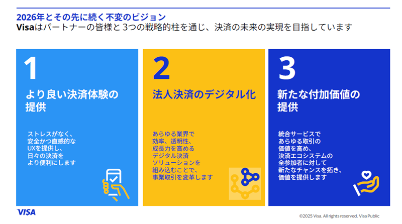 キトニー氏は「消費者体験、法人決済、そして付加価値サービスの三本柱に注力することで、Visaは新たなチャンスを掴み、パートナーと共に決済の未来を切り拓く強固な体制を整えています」と説明する。