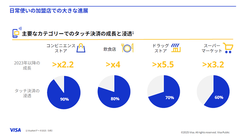 キトニー氏は「これらの店舗が普段は来店しないような顧客も含め、より多くの方を呼び込み、売上の増加を促進しています。大阪での非接触決済の利用は、2024年4月から2025年9月のプロモーション期間中に180万人増加し、この地域の消費者の間で非接触決済技術が急速に広く浸透していることを示しています」と話す。大阪における非接触決済の普及率は74%に達し、全国平均の66%を上回った。キトニー氏は「これは、私たちが実施した的確な施策が消費者の利用促進と関与向上に効果的であったことを示しています」と語る。大阪におけるアクティブなVisaコンタクトレスカードは35%増加し、全国平均の14%を大きく上回った。大阪におけるタッチ決済対応のVisaカードの利用は、同期間の全国平均60%増に対し、101%増加した。