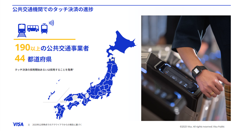 小売業だけではなく、公共交通においても大きな影響を及ぼしているそうだ。ここ1年で、日本の公共交通機関におけるタッチ決済の普及が急速に進んでおり、導入または導入予定の交通事業者の数は、現在では44都道府県で190を超えた。
