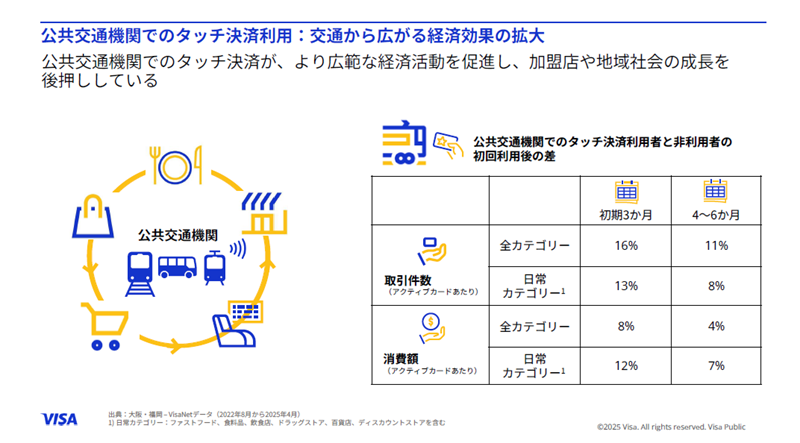 大阪と福岡での過去12カ月の実績から得られたデータによると、交通機関でTap to Rideを利用するVisaカード保有者は、日常の利用分野において交通機関を利用しない人よりも、取引数と支出が常に高いことが明らかになった。QSR(クイック・サービス・レストラン)、食料品店、一般のレストラン、ドラッグストア、デパート、ディスカウントストアなどがある。キトニー氏は「消費者が交通機関でタッチ決済対応のVisaカードやVisaの支払い情報を使い始めてから最初の3カ月間に、Tap to Ride利用者が非利用者よりも13%多く取引を行い、そのVisaカードで12%多く支出していることを示しています」とした。Tap to Rideユーザーは、初めてその取引を行ってから6カ月経っても、それ以外のユーザーに比べて取引回数が8%多く、支出も7%高い。また、すべてのカテゴリーに範囲を広げると、その差はさらに大きくなる。Tap to Rideユーザーは最初の3カ月間で合計16%多く取引を行い、8%多く支出するが、その差は6か月経ってもそれぞ11%と4%のまま持続している。