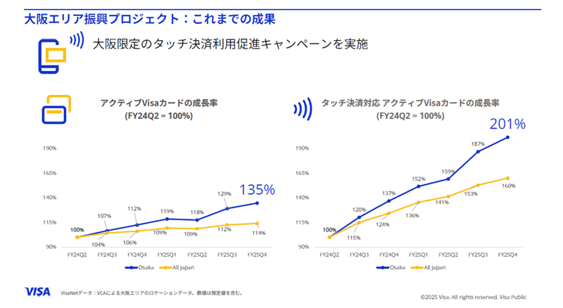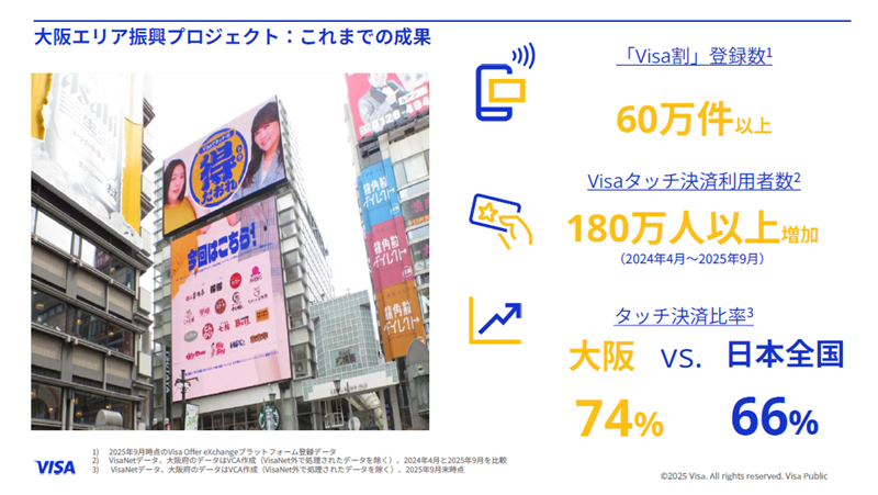 Visaは、2024年4月にキャッシュレスを通じた大阪府の地域経済活性化を目指す継続的かつ長期的な取り組みとして「大阪エリア振興プロジェクト」をスタートし、大阪におけるタッチ決済の普及と地域経済の活性化を力強く推進してきた。Visaは加盟店向けマーケティングプログラムを開始。その登録者数は60万件を超え、Visaの提供するオファーやそれに関連するキャンペーンに対して非常に高い関心が示された。参加する加盟店はVisaのマーケティング活動によって高まった認知度の恩恵を受けただけでなく、同プラットフォームを通じて、許可を得た上でVisaの消費者に直接自社をPRすることも可能だった。