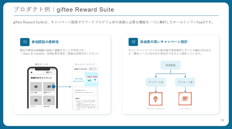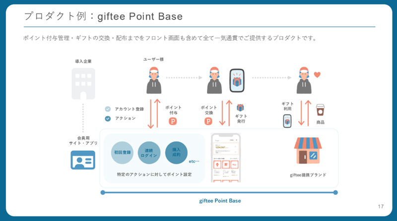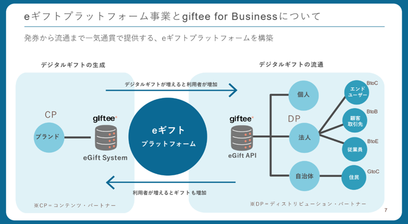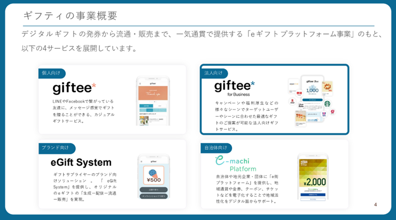 ギフティは、法人向けのgiftee for Business のほか、個人向けのgifteeサービスやブランド向けのeGift System、自治体向けのe-machi Platformを展開している。