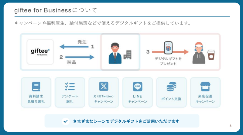 ギフティは2016年から、デジタルギフトを活用し、アンケートの謝礼や来店促進、SNSを活用したキャンペーン等、BtoC領域の施策を推進するgiftee for Businessサービスを提供している。2022年10月には、BtoCに加え、従業員向けのBtoE、BtoB、出産・子育て支援などを提供する自治体向けのGtoCへも領域を拡大した。