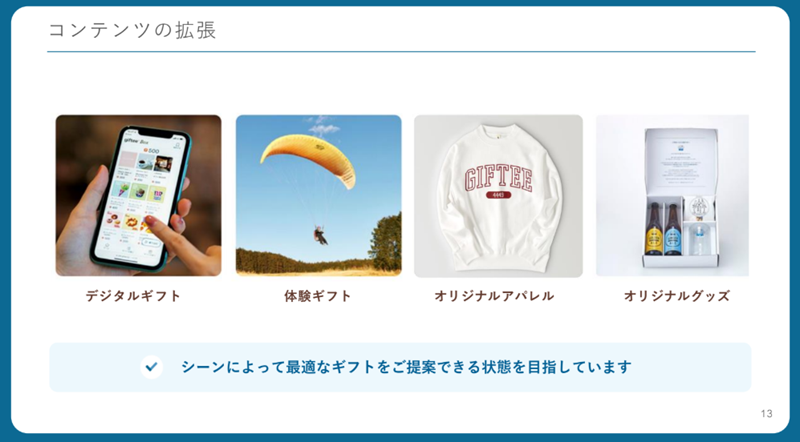 giftee for Businessの成長戦略は、デジタルギフトから体験ギフト、オリジナルアパレル、オリジナルグッズなど「コンテンツの拡張」と、giftee Box、えらべるPayなどの「ギフトフォーマットの拡張」、メール配信やアンケート、抽選、購買判定など「配布ソリューションの拡張」、Promotion Gift、Government Gift、Corporate Giftなど「提供領域の拡張」の4本の柱を中心に展開している。