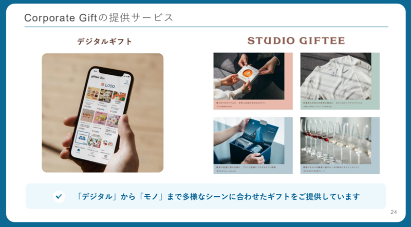 提供領域の拡張として2022年に投入したCorporate Giftは、企業が取引先や顧客、従業員に対して関係性構築・関係性強化を目的として感謝の気持ちを示すために贈るギフトを指す。サービスをリリースした2022年第3四半期と比べて、2025年第3四半期は案件数が約4倍に成長しているという。