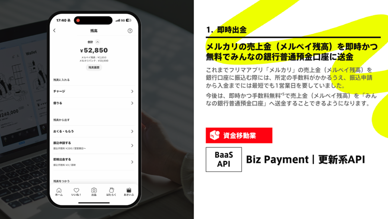 具体的に、即時出金は、メルカリの売上金、メルペイ残高を即時かつ無料でみんなの銀行の普通預金口座に送金できる仕組みだ。同仕組みはメルカリ、メルペイの中の資金移動業を使い、みんなの銀行の振込のAPIを組み合わせて実現しているサービスだ。