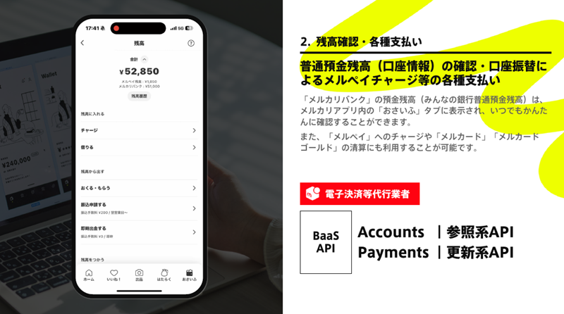 また、メルカリバンクとみんなの銀行の口座と API でつなぐことで、メルペイ残高から口座への移動が即時で完了する。残高確認、各種支払いでは、みんなの銀行の参照系API 、更新系APIにより、口座残高はメルカリアプリ内の「おさいふ」タブに表示され、いつでも確認することができる。また、メルペイへのチャージや「メルカード」「メルカード ゴールド」の清算にも利用することが可能だ。