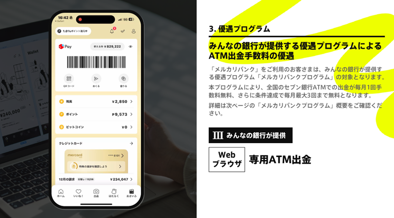 さらに、メルカリバンク」利用者は、みんなの銀行が提供する優遇プログラム「メルカリバンクプログラム」の対象となる。同プログラムにより、全国のセブン銀行ATM での出金が毎月1 回手数料無料、さらに条件達成で毎月最大3 回まで無料だ。ATM出金に関してもメルカリアプリからダイレクトにWebブラウザを使って口座出金が可能だ。