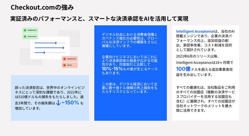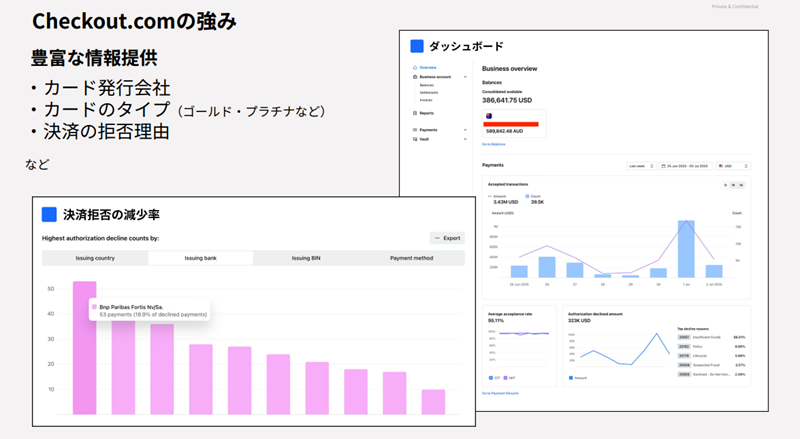 不正を抑止する堅牢なセキュリティ、信頼性の高いアップタイムと高い処理能力も特徴だ。さらに、豊富なデータに基づく分析とインサイトの提供、時差を感じないグローバルなサポート体制、主要国を広くカバー したローカルアクワイアリングも強みとなっている。