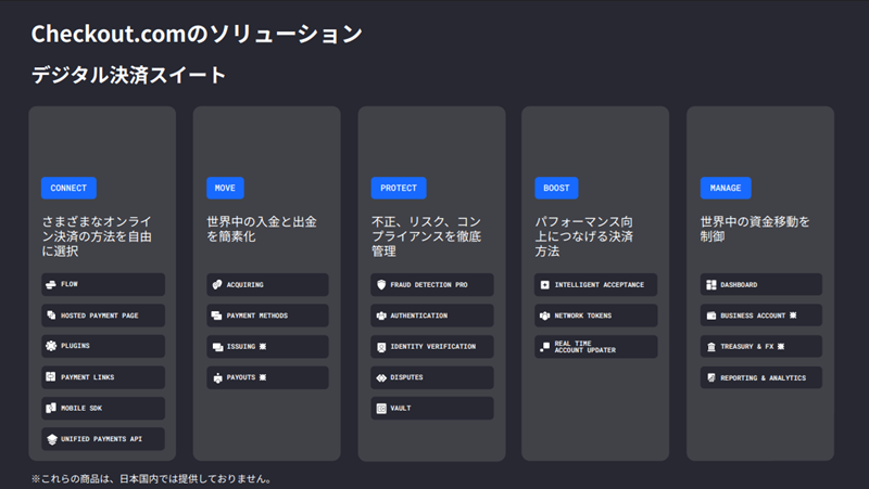 デジタル決済スイートの「CONNECT」は、本決済エンジンで、主力製品のFLOW 、Unified Payments APIがスタンダードの決済の画面から、その後のメッセージングになるそうだ。「MOVE」は、入金と出金を簡素化する。「PROTECT」は、不正、リスク、コンプライアンスを管理するエンジンだ。FRAUD DETECTION PROは同社の不正検知システムのエンジンとなる。AUTHENTICATIONは3-Dセキュアなどの認証、IDENTITY VERIFICATIONは海外で本人認証するための仕組み、VAULTはカードを保管するサービスとなる。