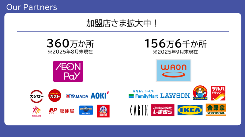 「AEON Pay」はイオングループ以外の加盟店を随時拡大しております。ご利用いただけるところは2025年8月末時点で360万カ所、「WAON」は2025年9月末時点で156万カ所となっており、お客さまの利便性の向上に向けてますますの拡大を図っています。
