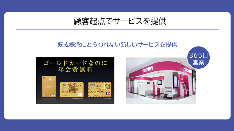 そういった創業時の経緯もあって、私たちはいつもお客さまの視点に立って、既成概念にとらわれない新しいサービスを提供してきました。たとえば、今ではスタンダードになっていますが、当時は珍しかった年会費無料のイオンゴールドカードの発行や、365日営業の銀行店舗などは、私たちがパイオニアとして生み出したサービスです。